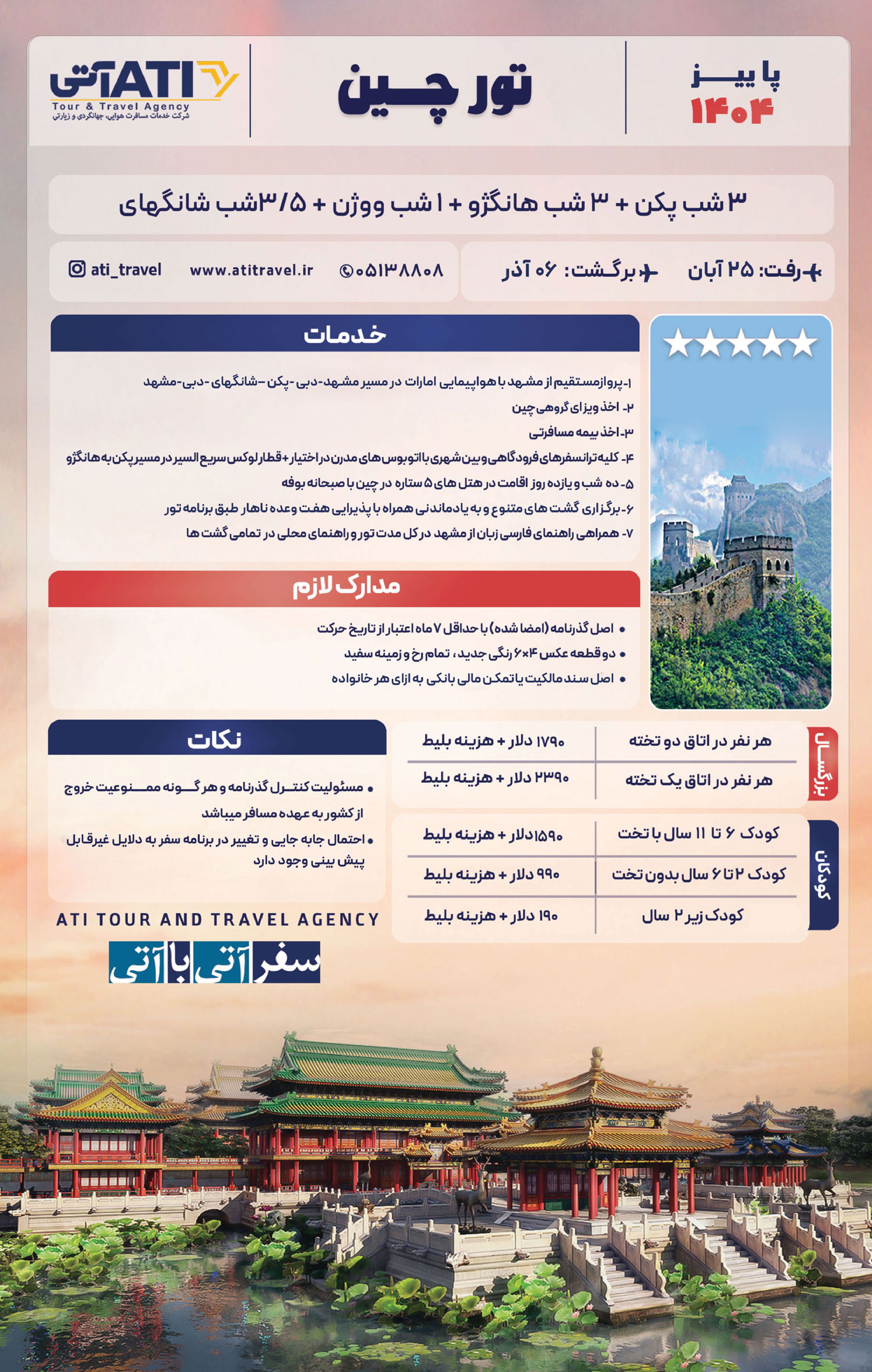 ۳ شب پکن + ۳ شب هانگژو + ۱ ووژن + ۳/۵ شب شانگهای