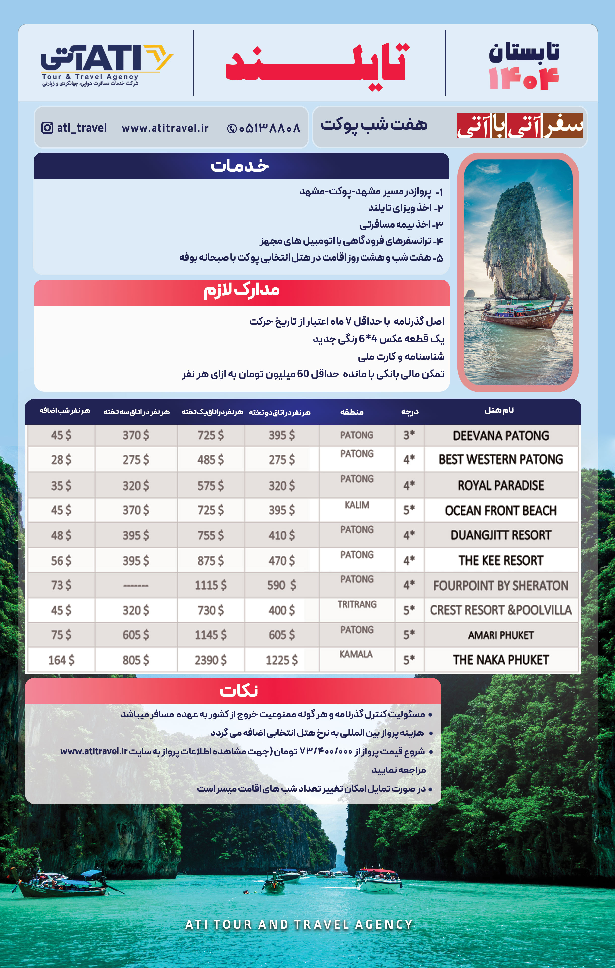 - ۵- هفت شب و هشت روز اقامت در هتل انتخابی پوکت با صبحانه بوفه